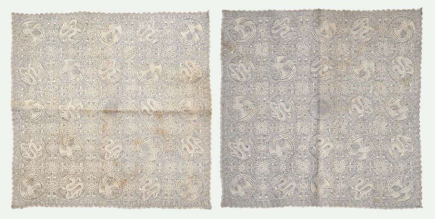 Deux rangs de mandarin carrés en dentelle brodée de 25 médaillons chacun, alternant dragons et phénix, laissant leur médaillon central vierge en son centre.