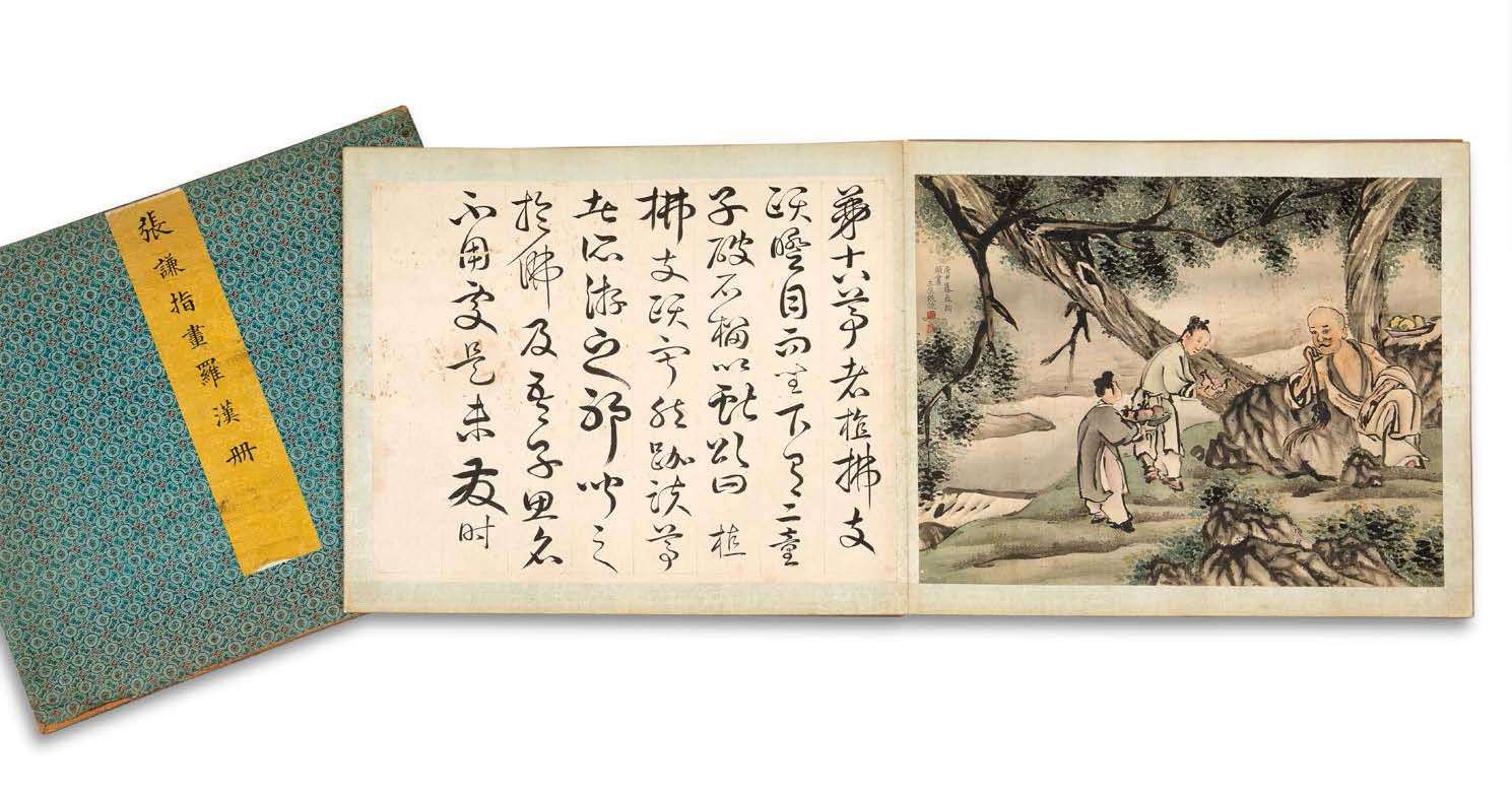 Album en accordéon intitulé «Album de Luohan de Zhangqian», comprenant dix-huit peintures au lavis d'encre et couleurs légères sur soie, chacune représentant un des dix-huit luohan, et accompagnée en regard sur la page de gauche, d'une calligraphie sur papier évoquant le luohan, l'album précédé de deux longues calligraphies et terminé par une troisième calligraphie, sur le thème des luohan. Signé Zhangqian.