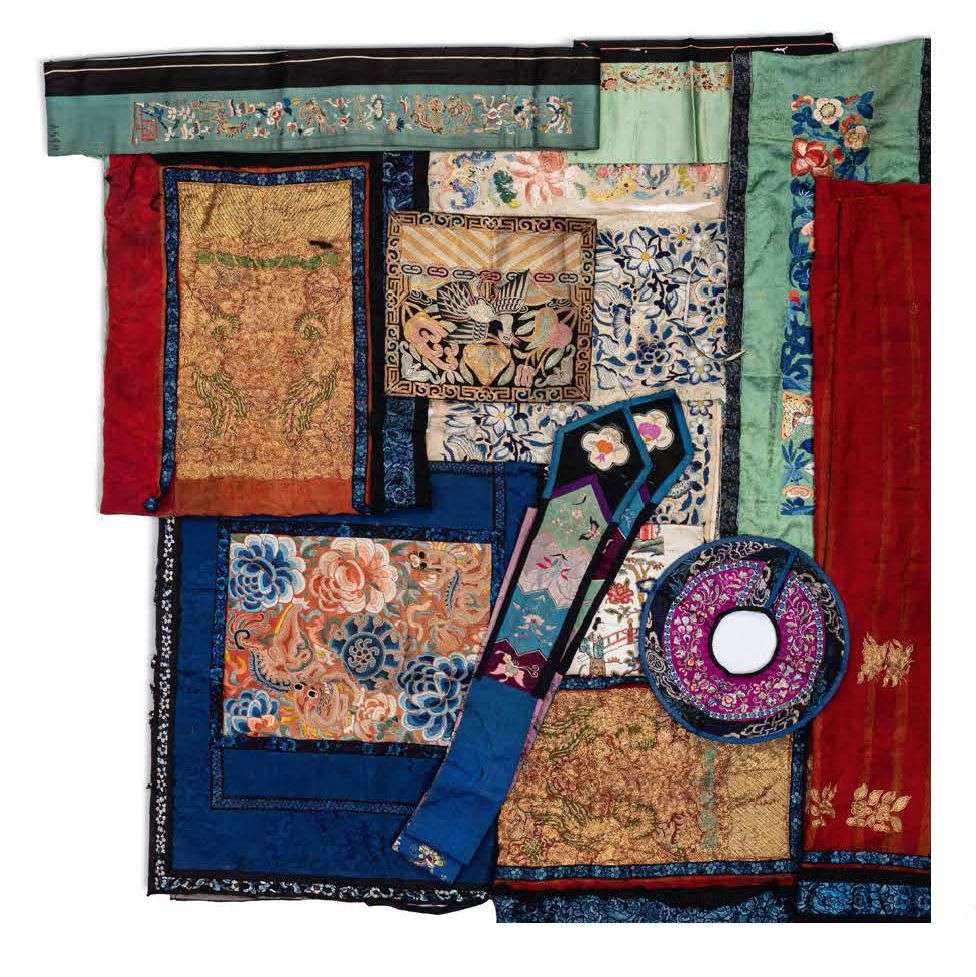 Lot comprenant un ensemble de 14 éléments textiles en soie et lin brodés, à décor d'oiseaux, fleurs, et un rang de mandarin.