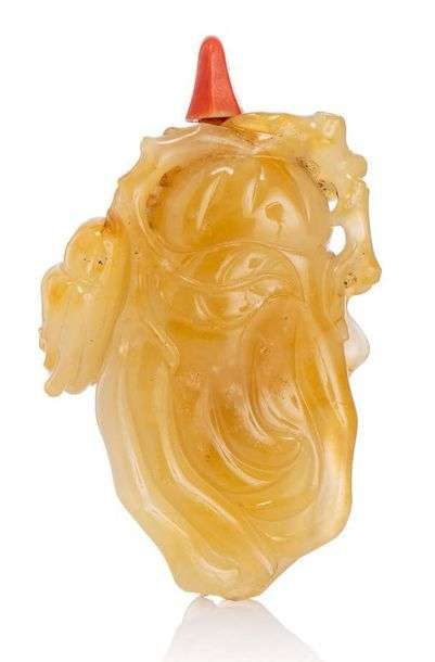 Flacon tabatière en agate blonde, en forme de citron digité dit «main de Bouddha». Bouchon en corail.