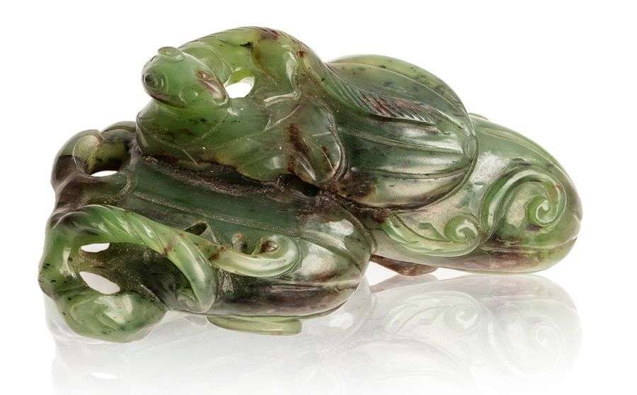 Pendentif en jade vert foncé veiné de brun sculpté et ajouré de deux courges avec leurs feuillages.
