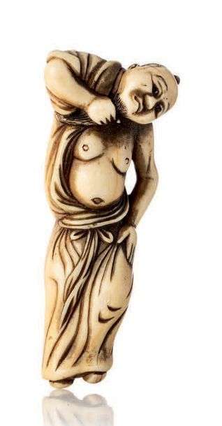 Deux netsuke en ivoire rehaussés de brun, l'un représentant un rakan allongé sur le côté se tenant la barbe, drapé dans son vêtement, laissant son torse dénudé. Les yeux incrustés de corne brune. L'autre figurant une corbeille de feuillages.