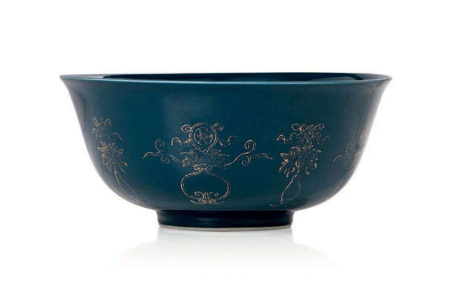 Coupe en porcelaine et émail bleu canard, à décor rehaussé d'or, de vases et compositions florales, l'intérieur orné de chauves-souris et caractère shou.