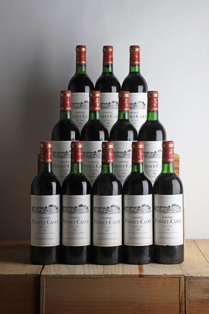 12 B CHÂTEAU PONTET CANET (Caisse Bois d'origine) (4 B.G| 3 T.L.B.+| 2 T.L.B| 3 e.l.a| 1 e.a| 1 c.l.a. bas de jupe) - 1981 - GCC5 Pauillac