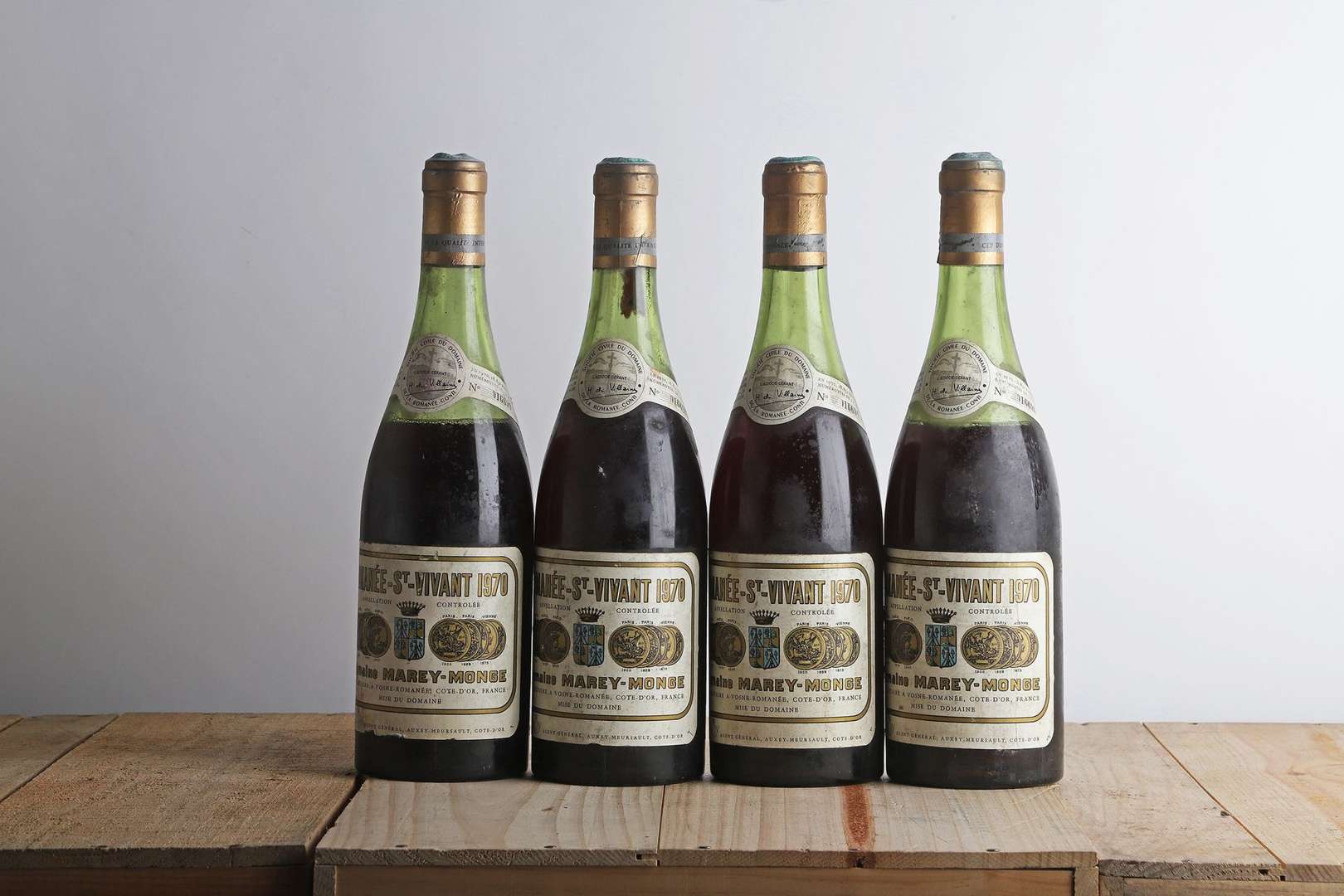 4 B ROMANÉE ST-VIVANT (Grand Cru) (2 à 6 et 2 à 7,5 cm| e.t.h. à e.l.a| 3 capsules bosselées) - 1970 - Marey-Monge