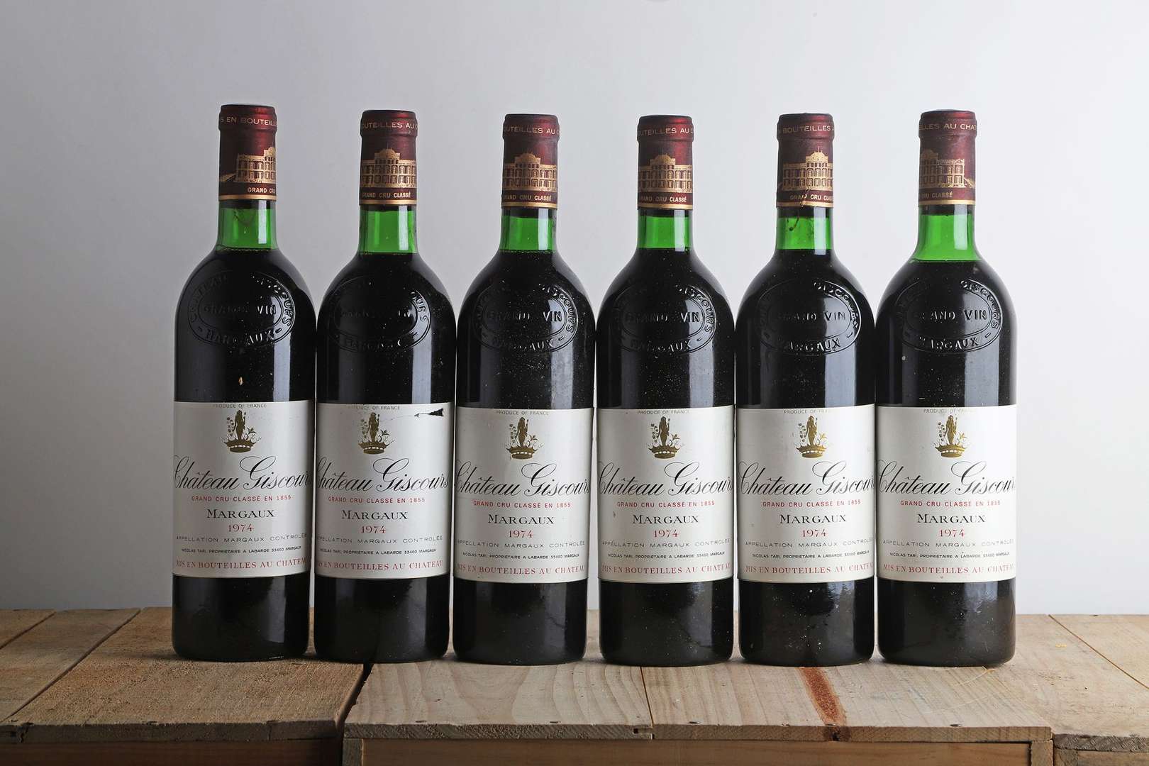 6 B CHÂTEAU GISCOURS (Caisse Bois d'origine) (3 B.G| 1 T.L.B.+| 1 T.L.B| 1 H.E.+| 1 e.a.) - 1974 - GCC3 Margaux