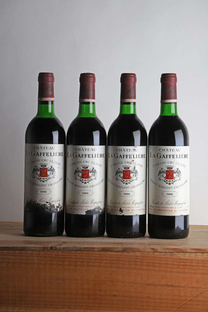 4 B CHÂTEAU LA GAFFELIÈRE (1 B.G| 1 T.L.B| 2 H.E.+| 2 e.a| 2 e.t.a| 2 bouchons légèrement engagés) - 1986 - GCC1B Saint-Emilion