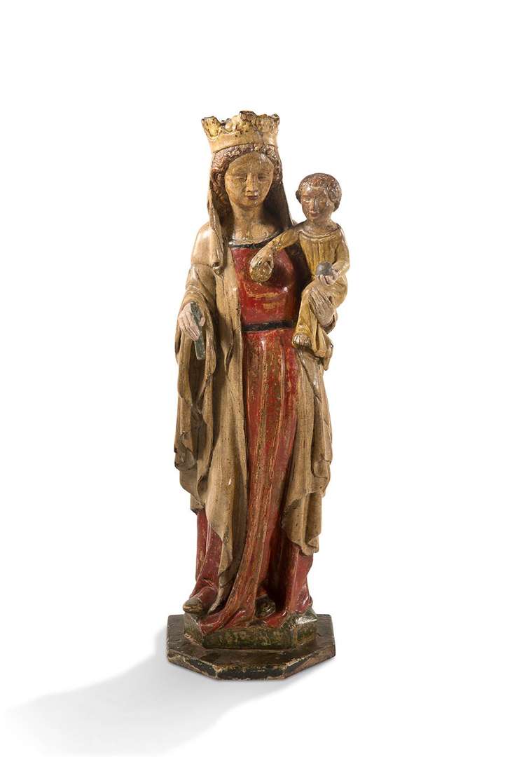 + VIERGE À L'ENFANT en noyer sculpté, polychromé et doré, dos ébauché. Légèrement déhanchée, elle porte l'Enfant sur son bras gauche | couronne fleuronnée posée sur une chevelure ondulée | visage large aux yeux effilés et à l'expression aimable.