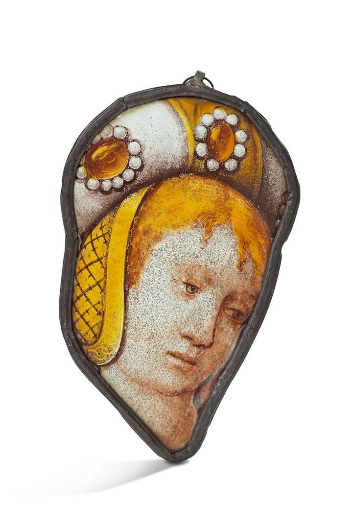 VITRAIL Fragment de vitrail en grisaille et jaune d'argent représentant une tête de femme coiffée d'un turban orné de cabochons et de perles, Marie de Bourgogne ?