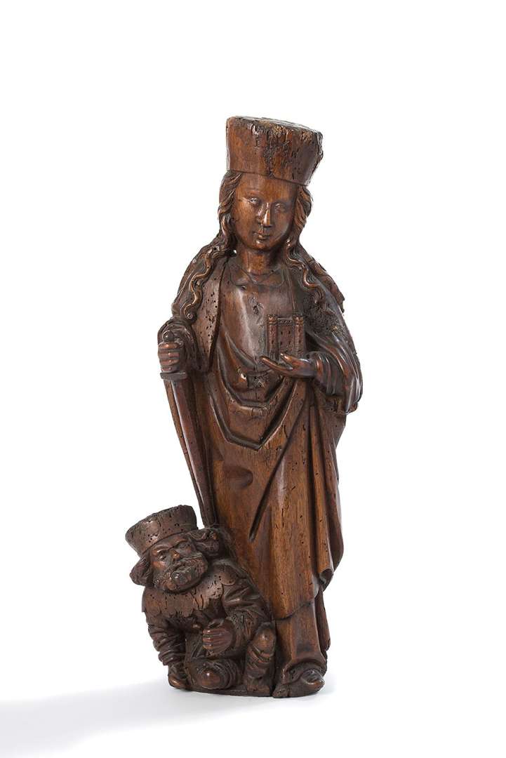 SAINTE BARBE en noyer sculpté. Debout, la tête ceinte d'une couronne, elle porte une tour fortifiée de sa main gauche et tient l'épée de son martyre de l'autre | elle foule de ses pieds son père, son persécuteur.