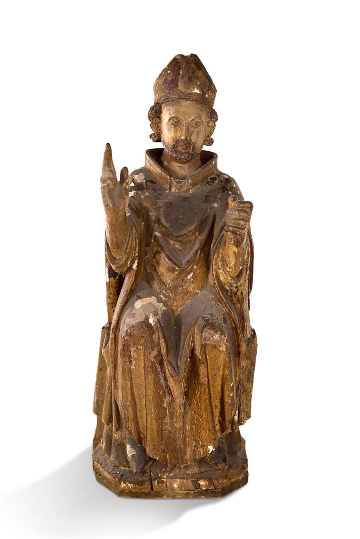 Assis sur un tabouret ajouré à arcatures, il bénit de sa main droite et devait tenir les clés dans l'autre main.