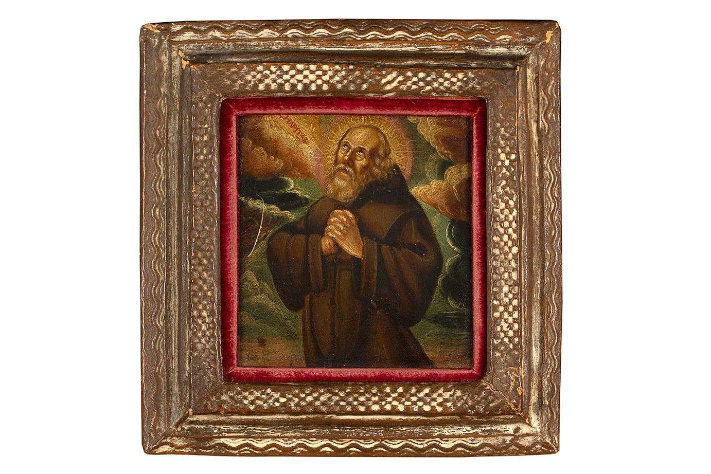 MOINE EN PRIÈRE Huile sur une plaque de laiton d'un instrument scientifique, datée 1625.