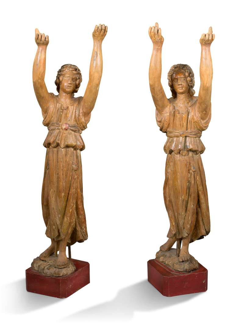 PAIRE D'ANGES en bois sculpté en ronde-bosse, polychromé avec restes de dorure. XVIIe siècle