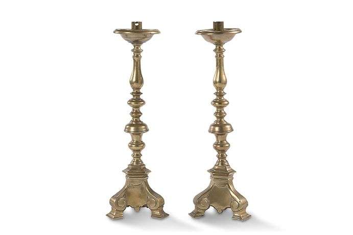 PAIRE DE PIQUE-CIERGES d'autel tripodes en bronze, fûts tournés en balustr