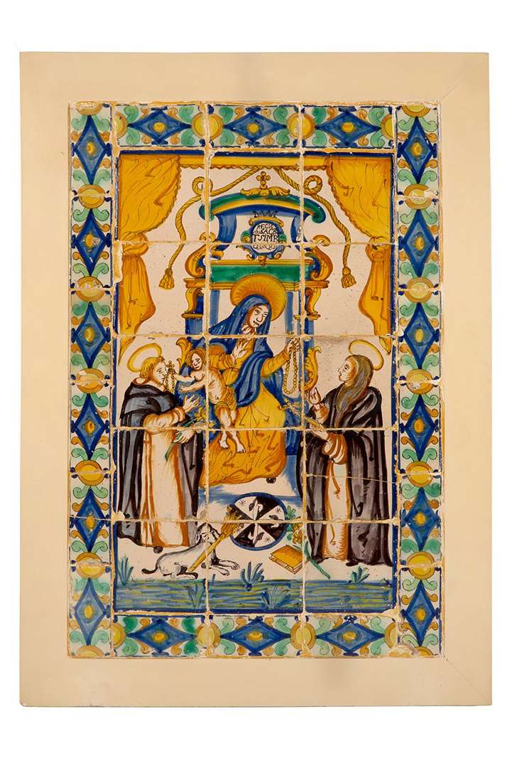 AZULEJOS Panneau d'azulejos polychromes représentant la Vierge du Rosaire entourée de saint