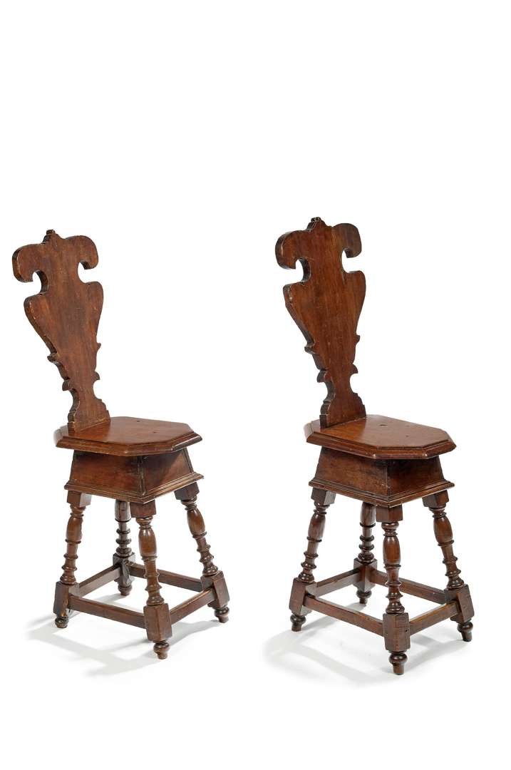 On y joint une paire d'escabelles en noyer, piètement en bois tourné.