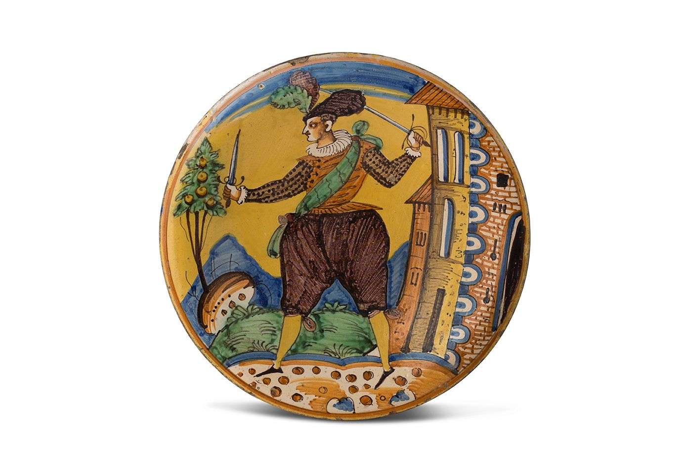 Plat rond en faïence à décor polychrome d'un soldat avec une épée et et une épé maingauche dans un paysage sur fond jaune.