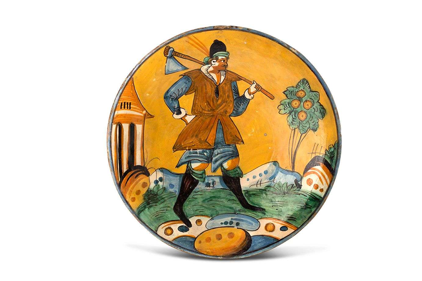 Plat rond en faïence à décor polychrome d'un soldat à la hallebarde dans un paysage sur fond jaune.