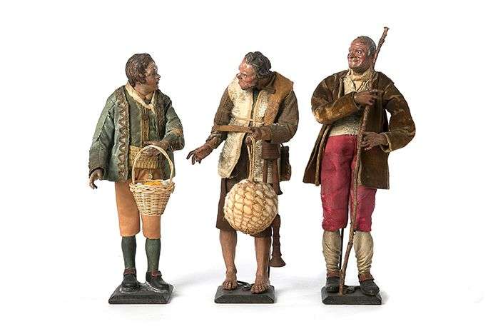 CRÈCHE NAPOLITAINE Trois personnages de crèche en terre cuite polychromée,
