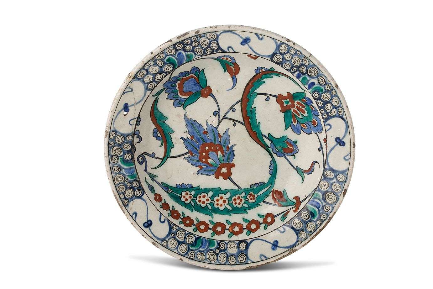 Plat «tabak» en céramique siliceuse, décoré en polychromie sur fond blanc d'une grande palme «saz» dentelée et ponctuée de fleurs, entourée d'oeillets et chèvrefeuilles.