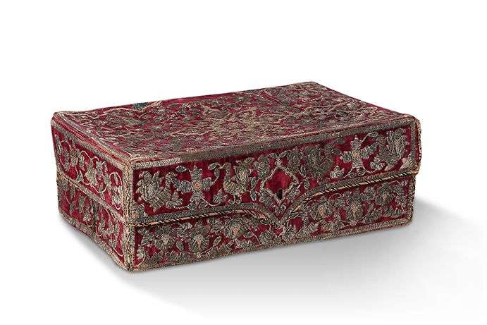 COFFRET OTTOMAN en velours rouge à décor de rinceaux feuillagés et d'oiseaux brodés en fils d'argent et de soie polychrome