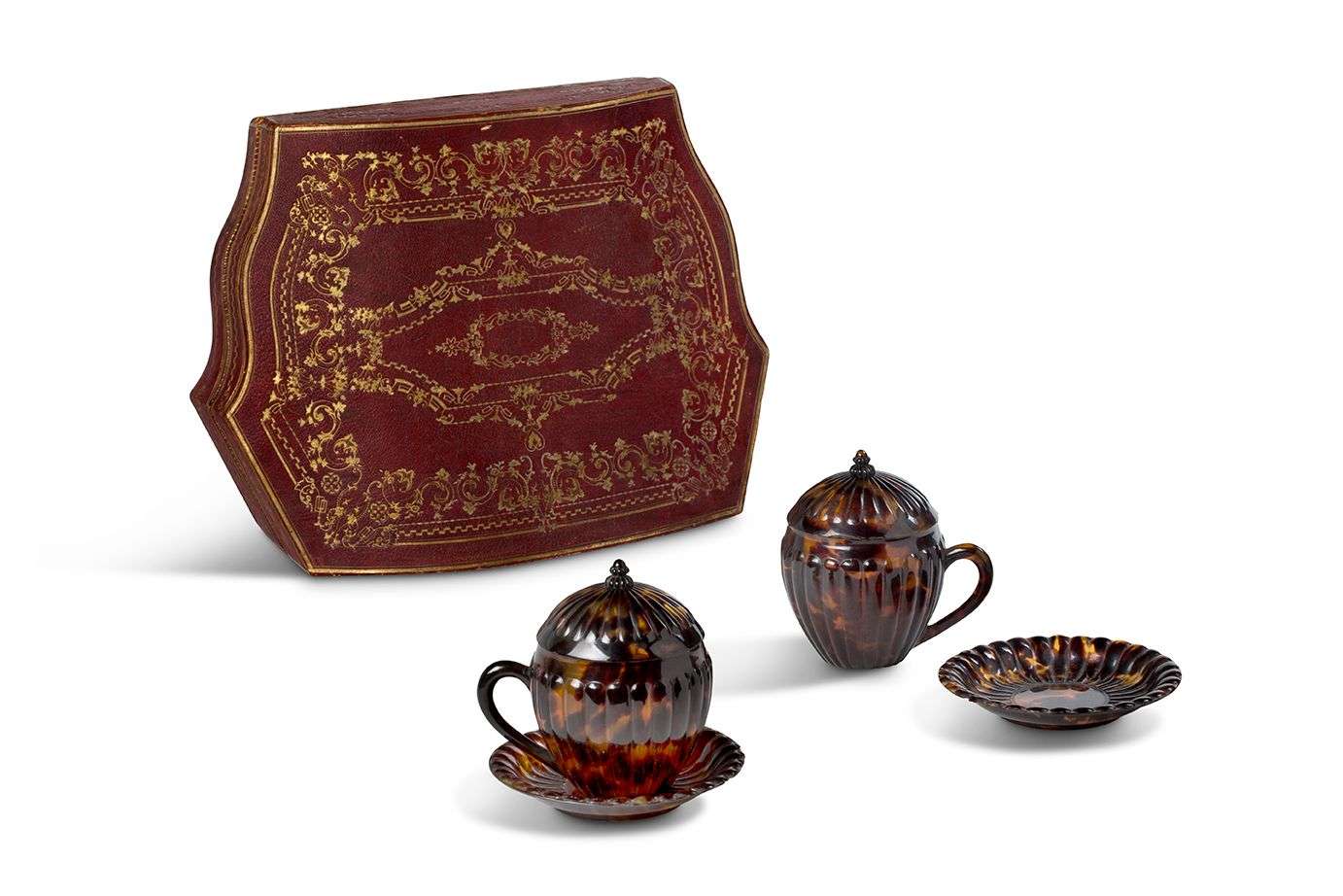 PAIRE DE TASSES À SHERBET couvertes, anses détachées et prises en graine, et leurs soucoupes entirèrement en écaille de tortue godronnée.
