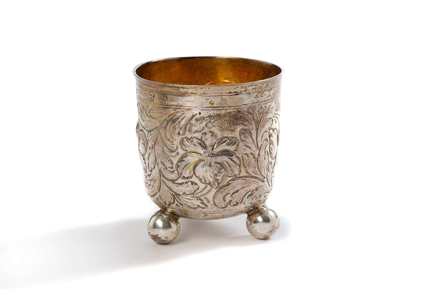 GOBELET EN ARGENT à décor de fleurs en repoussé posant sur trois pieds bou