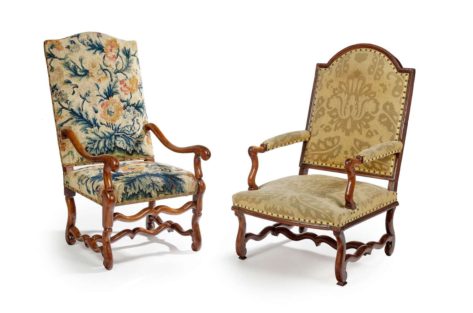 DEUX FAUTEUILS dits «à os de mouton» en noyer mouluré.