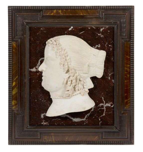 PROFIL EN BAS RELIEF d'une femme, la tête tournée vers la gauche, sculpté en marbre blanc sur fond de marbre rouge veiné blanc.