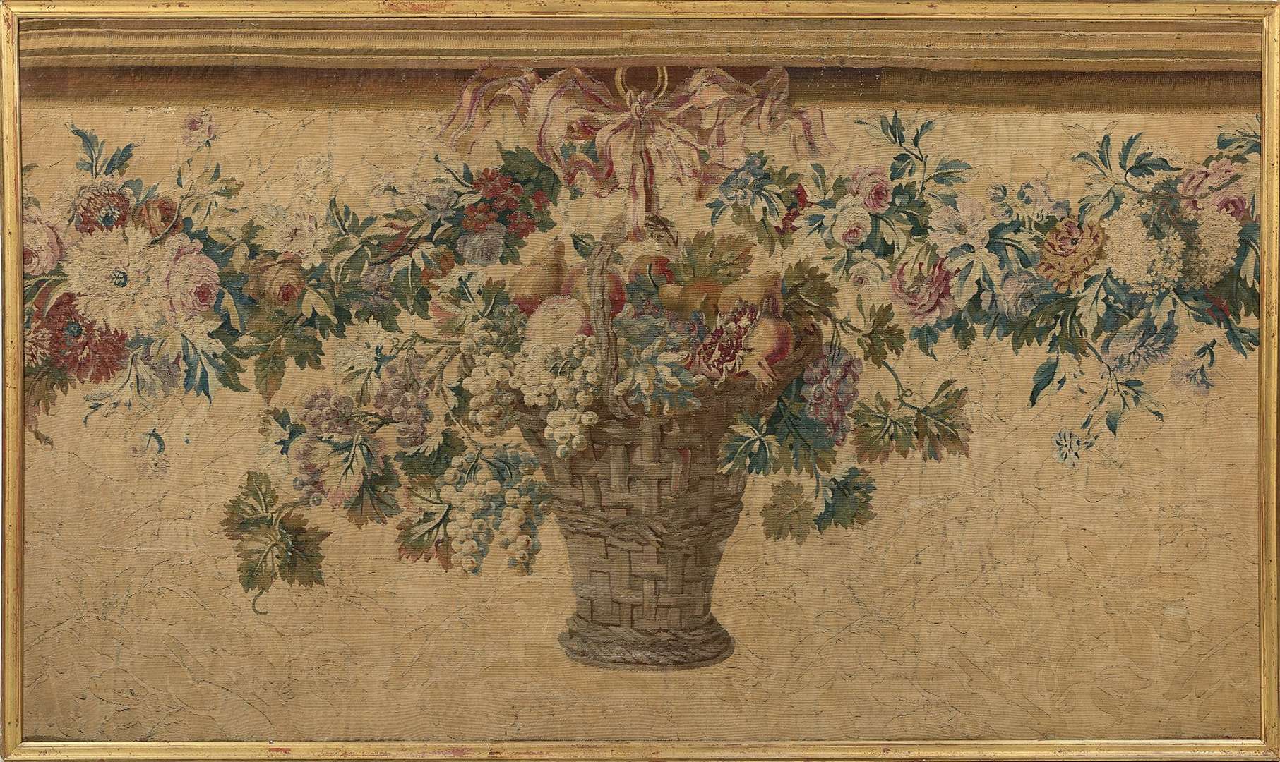 PANNEAU DE TAPISSERIE représentant un vase tressé suspendu, rempli de fruits et orné d'une guirlande fleurie, sur un fond damassé crème.