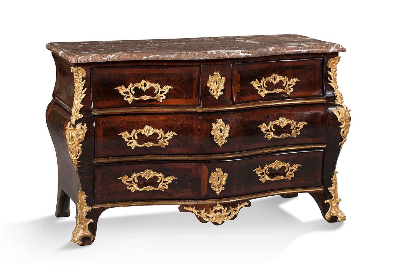 COMMODE TOMBEAU en placage de bois de violette et de palissandre. Elle ouvre en façade par quatre tiroirs sur trois rangs. Montants à côtes pincées. Riche ornementation de bronzes rocaille ciselés et dorés tels que : poignées de tirage, entrées de serrures, sabots et culs de lampe. Plateau de marbre rouge veiné blanc (Restauré).
