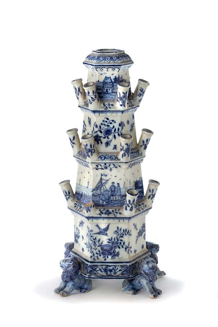 TULIPIERE en forme d'obélisque à dix huits entrées de fleurs en faïence à décor monochrome bleu sur fond blanc de personnages marins, paysages et oiseaux. Repose sur quatre lions.