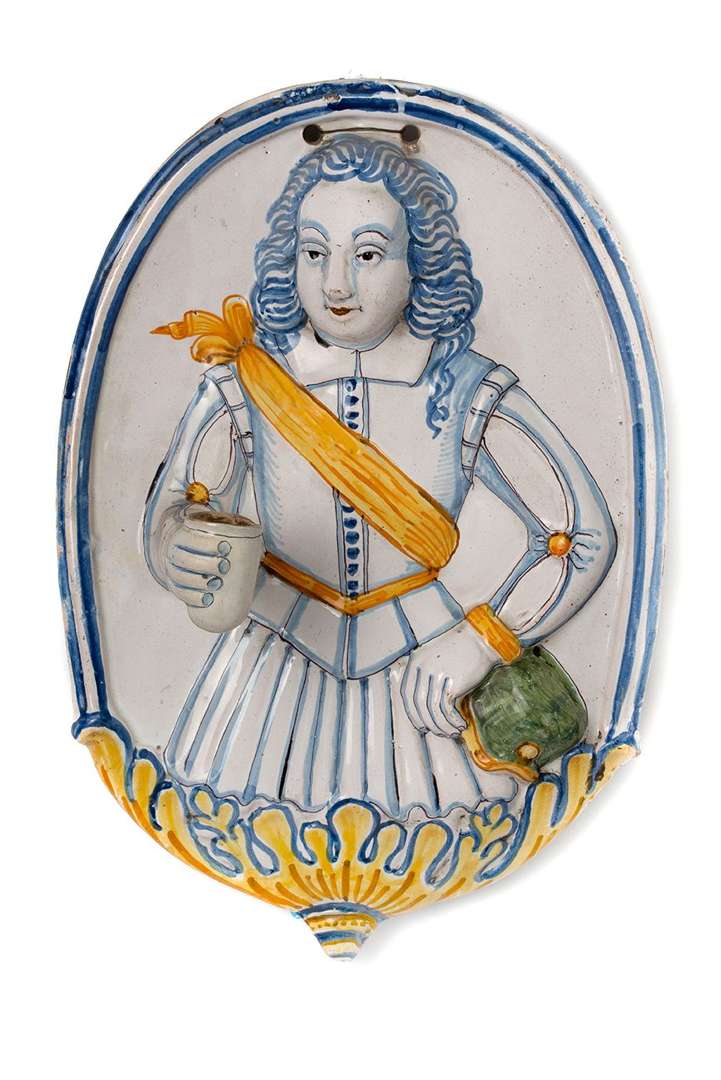 SUITE DE TROIS APPLIQUES formant bras de lumière en faïence à décor en bas-relief sur une plaque ovale d'un homme en costume du XVIIe siècle la main droite formant bougeoir, décor bleu, ocre et jaune a compendiario.