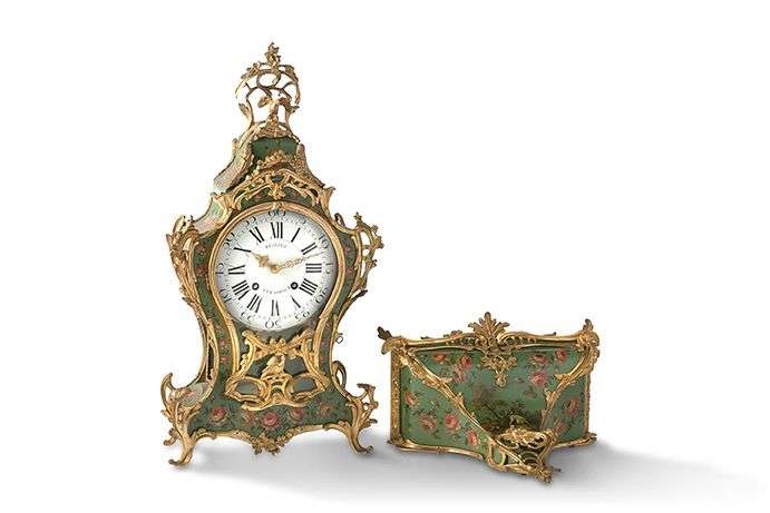 CARTEL D'APPLIQUE et sa console, de forme violonnée en bois peint à l'imitation du laque de roses et scène de chasse d'après Desportes sur la console sur un fond vert. Ame de bois estampillée de Adrien Jérôme Jollain (reçu maître en 1763).Cadran par Rilliet à Stasbourg (exerce depuis la fin du XVIIIe)*