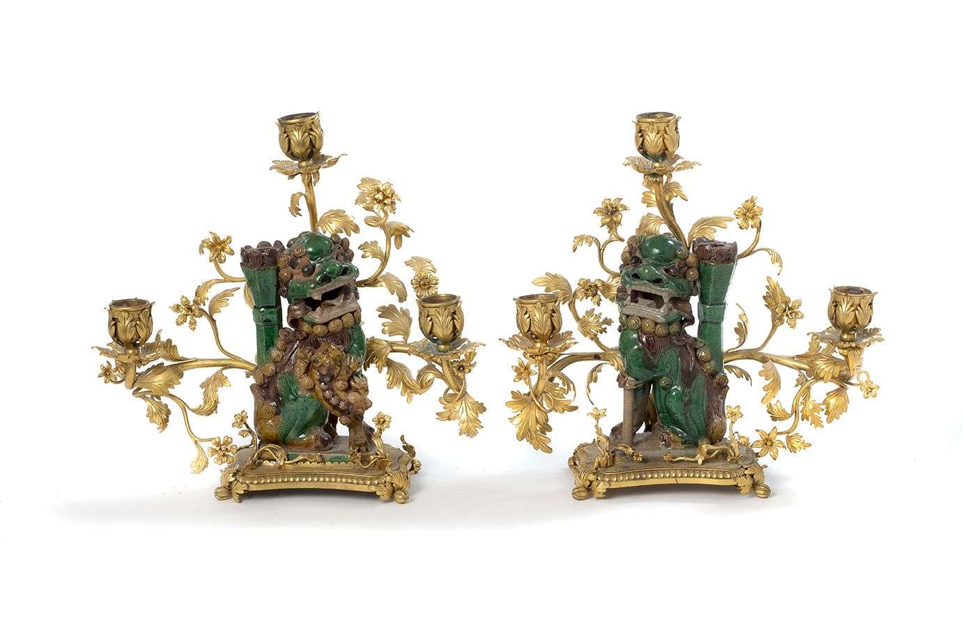 PAIRE DE CANDELABRES formé d'une paire de chiens de Fô porte-bâtons d'encens en grès émaillé sur une monture de bronze doré à deux bras de lumières.