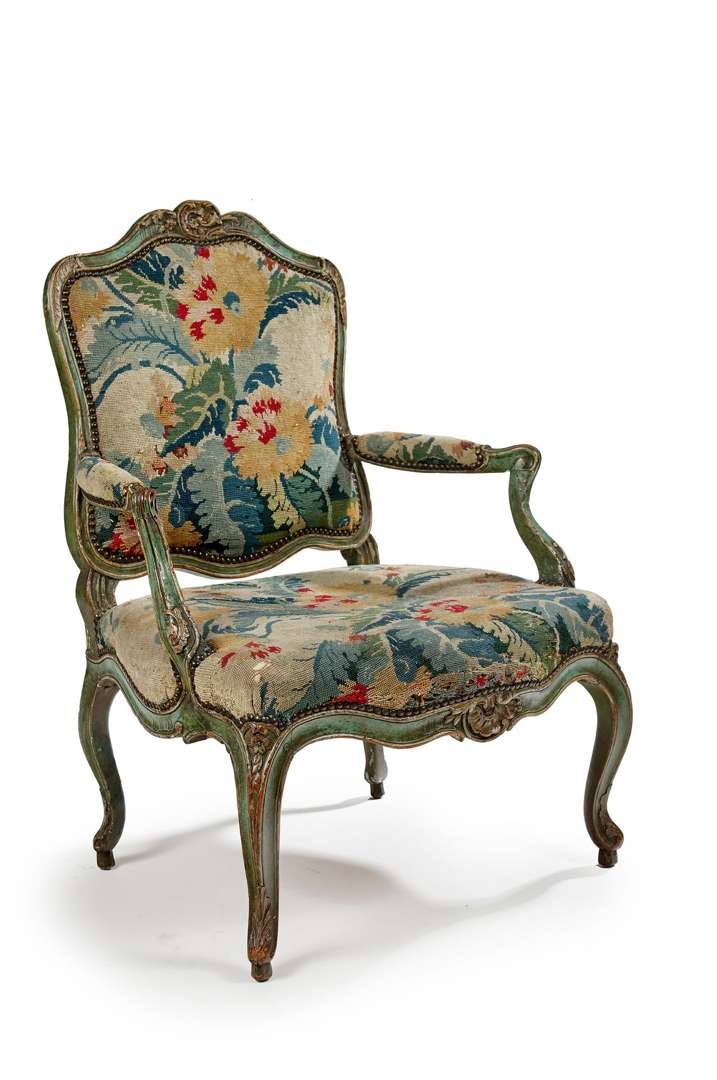FAUTEUIL «À LA REINE» en hêtre mouluré, sculpté, laqué vert pâle et rechampi à motifs rocailles, il repose sur des petits pieds à enroulements.