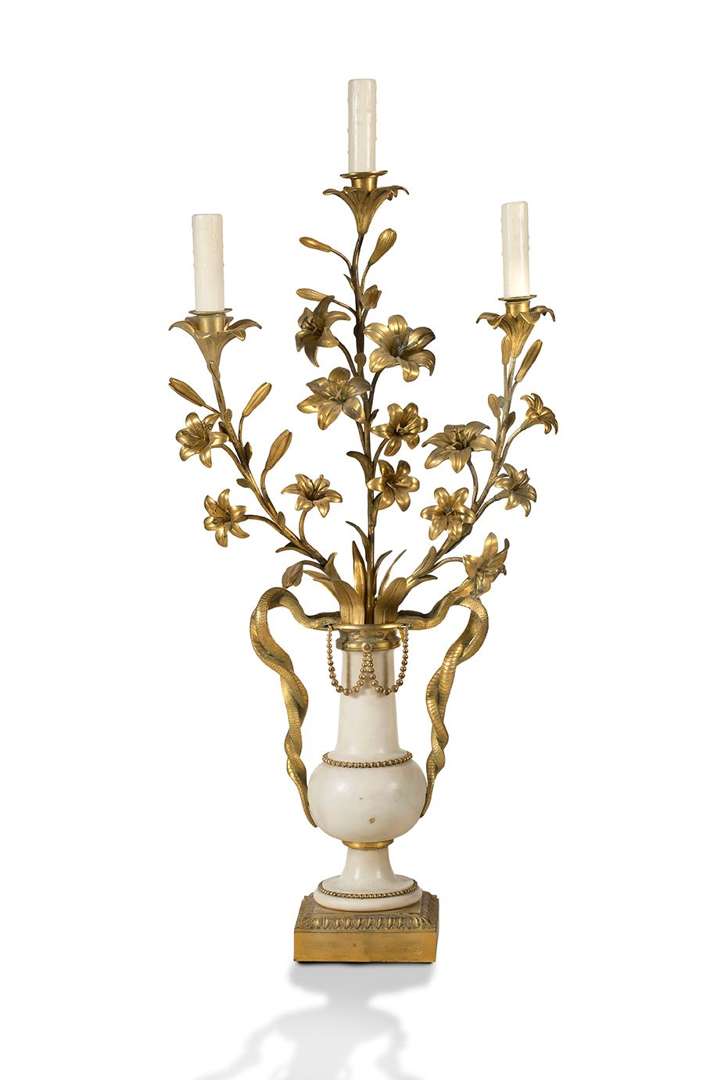 GRANDE PAIRE DE CANDELABRES à trois lumières en bronze ciselé et doré et marbre blanc de Carrare | les bobèches supportées par des branchages de lys s'échappant d'un vase de forme balustre dont les anses sont formées de serpents entrelacés | base quadrangulaire à frise de raies de coeur et feuilles d'eau.