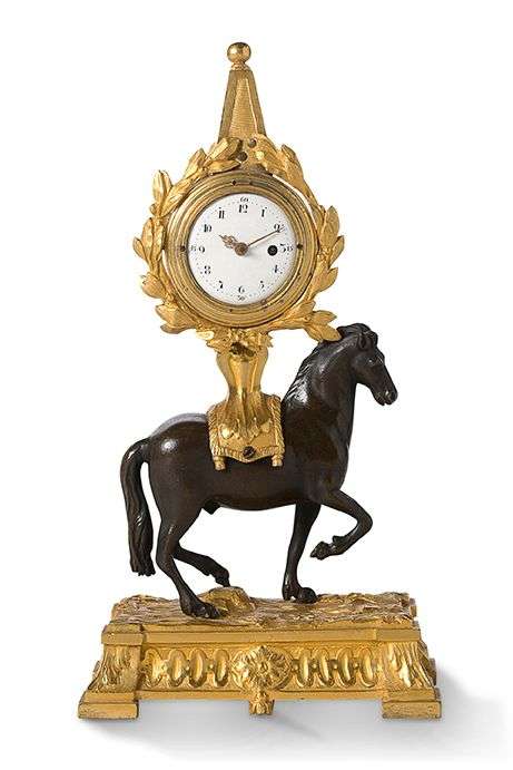 PETITE PENDULE en bronze à double patine brune et dorée figurant un cheval au trot supportant le cadran émaillé ceint d'une guirlande de lauriers, la base rectangulaire à décor d'oves et quartefeuilles