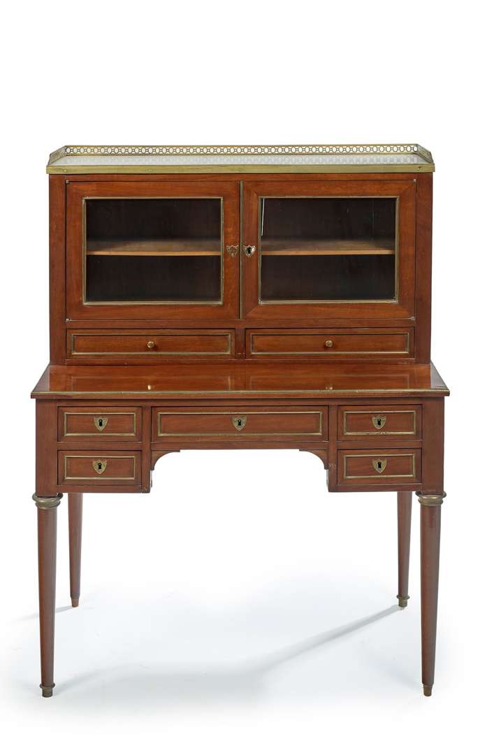 BONHEUR DU JOUR en acajou et placage d'acajou. Il ouvre à deux vantaux supérieurs vitrés surmontant deux tiroirs dans la partie haute et cinq tiroirs dans la partie basse. Il repose sur quatre pieds fuselés et bagué de bronze.