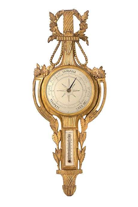 BAROMÈTRE-THERMOMÈTRE en bois sculpté et doré. Ornementation de fleurs et de guirlandes de perle.