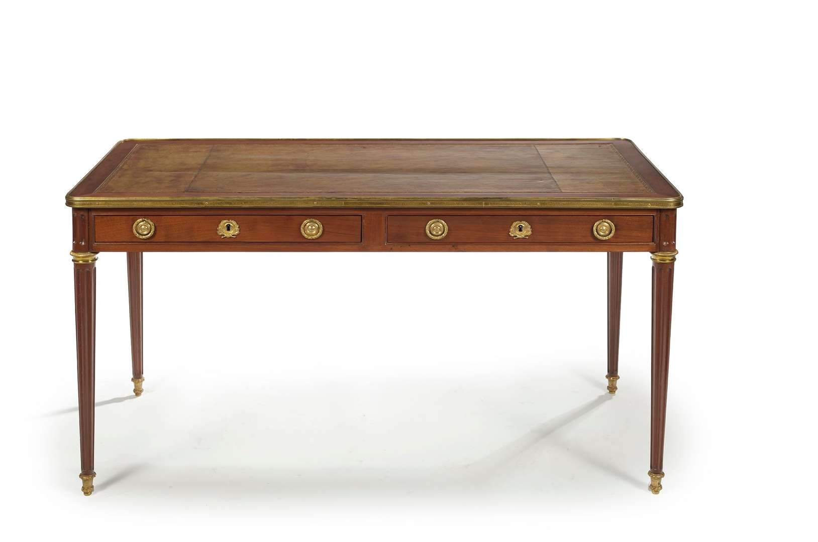 BUREAU PLAT en placage d'acajou, ouvrant à deux tiroirs en ceinture. Pieds fuselés cannelés.