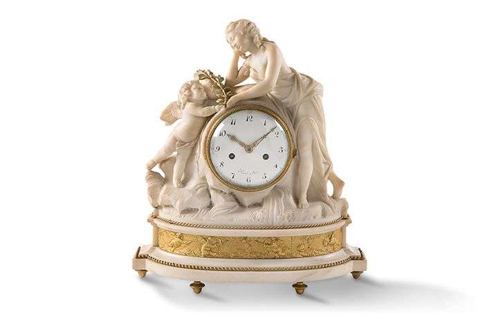PENDULE À «L'AMOUR MESSAGER» en marbre blanc au groupe sculpté où un enfant amour apporte une palme de bronze doré à une jeune femme acoudée | socle oblong à ressaut, orné d'une frise e n bronze doré à décor d'amours chasseurs, le cadran émaillé blanc signé