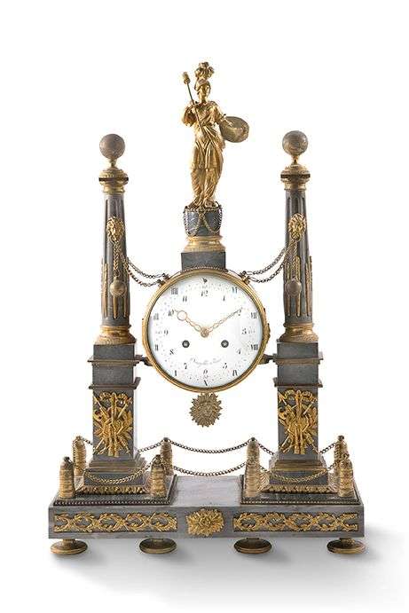 PENDULE PORTIQUE en marbre bleu turquin et bronze ciselé doré, le cadran émaillé signé Denoyelle à Paris (reçu maître en 1788) présente les heures et les minutes en chiffres arabes. Il est surmonté par une statuette figurant Athéna et soutenu par deux montants colonnes cannelées rudentées d'asperges ornées de mufles de lion et de trophée militaire.