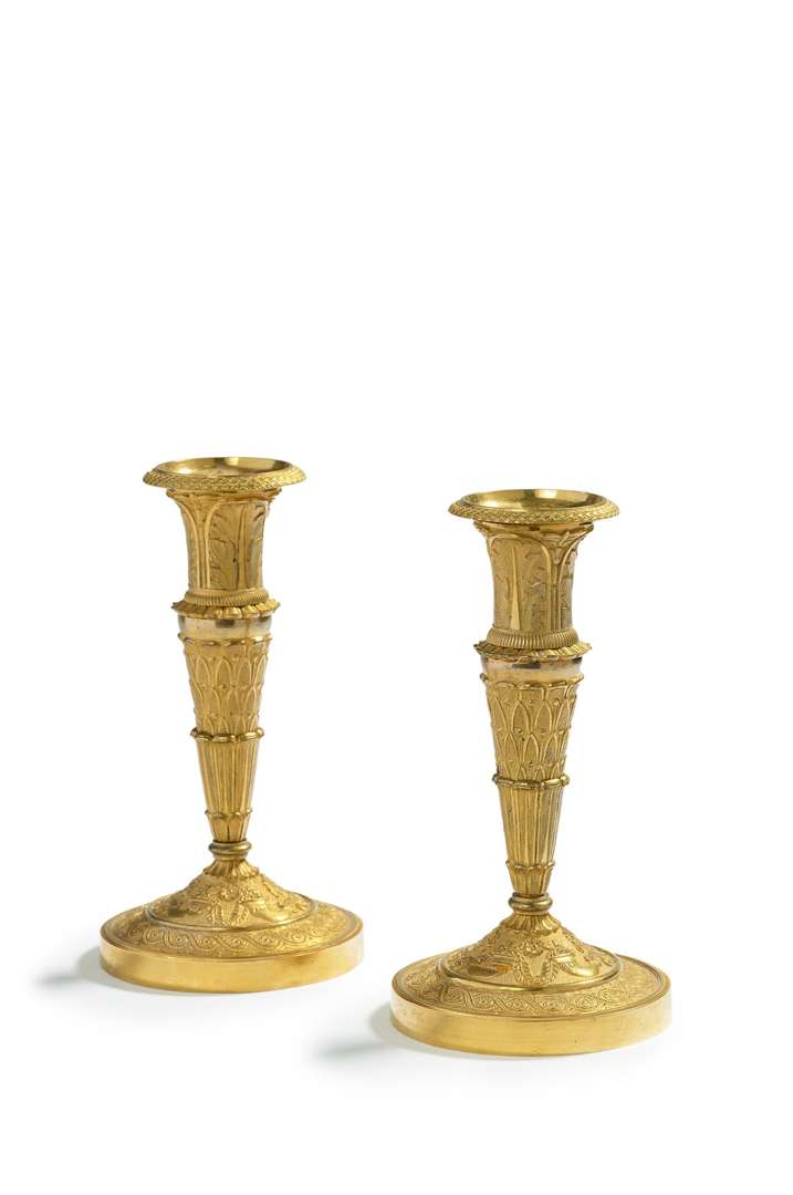 PAIRE DE FLAMBEAUX en bronze ciselé et doré. Le fût de forme tronconique est surmonté en partie haute de feuilles d'acanthe, la base de forme ronde est ornée d'une frise d'entrelacs et de cornes d'abondance. Avec ses bobèches.