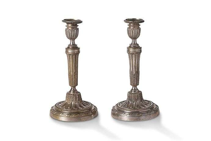 PAIRE DE FLAMBEAUX en bronze argenté, le binet godronné, le fut et la base