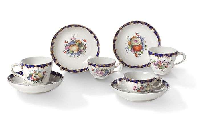TOURNAI ET LA HAYE Suite de deux paires de tasses et leurs sous-tasses en porcelaine tendre à décor émaillé polychrome de fruits et fleurs