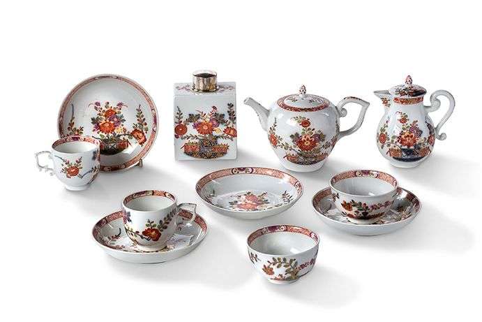 Kakiemon. Il est composé d'une théière couverte, d'un pot à lait couvert, d'un pot à thé rectangulaire (couvercle remplacé en métal argenté), de deux tasses à café et leur sous-tasses et de deux tasses à thé et leur sous-tasses.