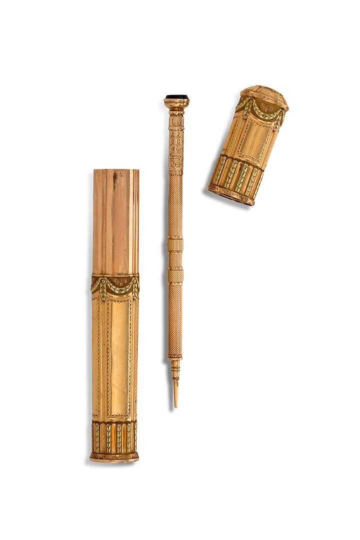 Il contient un stilet en or guilloché formant porte-mine et porte-plume. Présente un calendrier mensuel et un cabochon (viege) en jaspe sanguin. Doublement poinçonné.