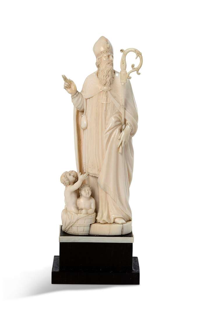 SAINT NICOLAS en ivoire sculpté en ronde-bosse, à ses pieds les trois jeun