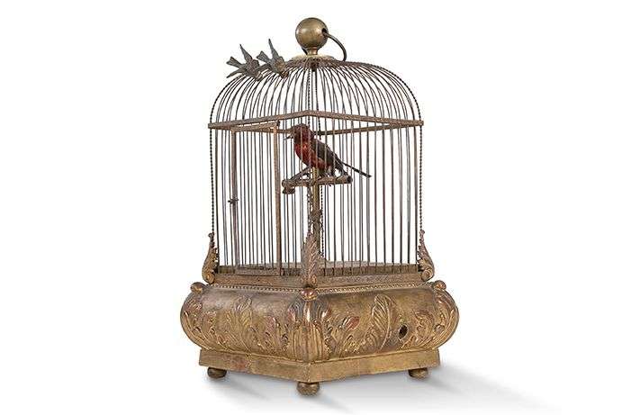 Cage à oiseaux chanteur à automate cage de forme carrée en métal doré, la base et bois et stuc dorée renferme un oiseau perché qui chante et qui bouge la tête, ouvre le bec et agite ses plumes.